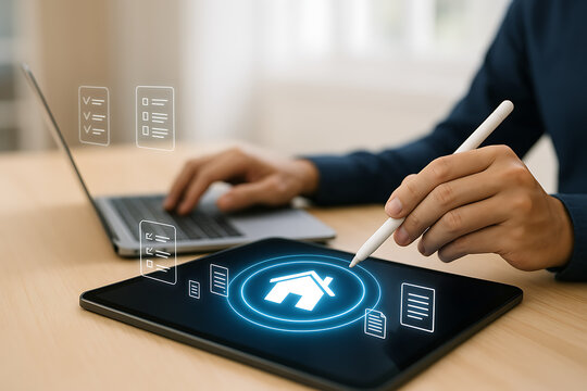 Real estate document interface on digital tablet with mortgage form checklist for property application processing system and investment loan filing using smart technology tools