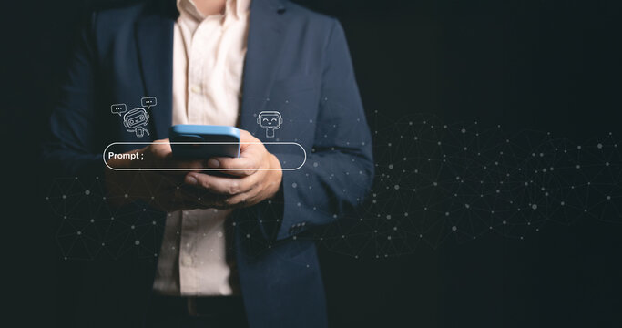 AI innovation and digital intelligence concept with businessman using smartphone and virtual AI interface, highlighting smart technology, automation, and data solutions for business strategy.