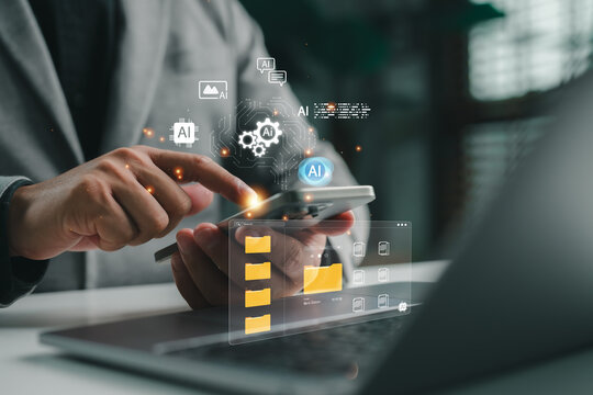 Businessman using smartphone with ai chatbot virtual assistant to help solve problems and provide support for artificial intelligence interaction
