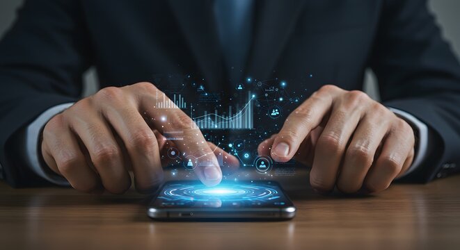 Businessman using smartphone with holographic data