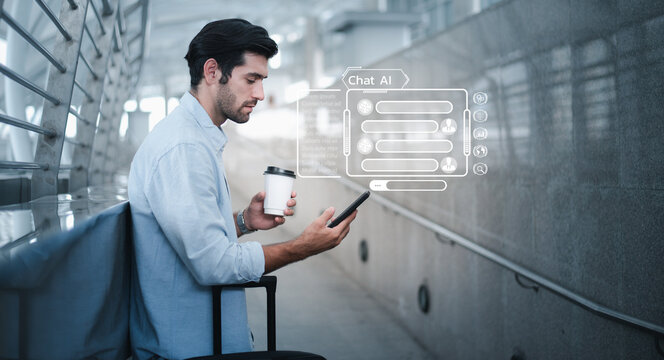 Chat bot Chat with AI,Artificial Intelligence. young adult tourist using mobile smartphone technology chatting with a digital chat on virtual screen,Search location,technology transformation.
