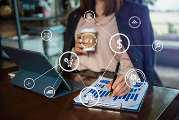 Digital marketing media and mobile payments. Businessman working with mobile smartphone and icon network connection on virtual screen. Online banking. Business and modern technology.