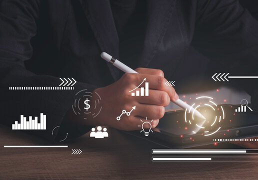 Finance analyst using digital tablet analyzing sales data and financial growth graph chart report, online marketing plan. Business strategy and development. Market research, data analysis