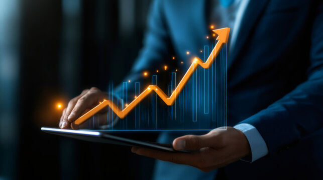 Businessman using digital tablet analyzing stock market data and financial growth chart with virtual technology representing investment strategy, economic success, and data-driven business innovation.
