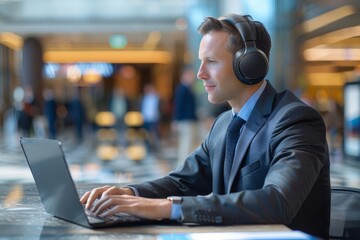 A young businessman works on his laptop in a casual, modern office, his wireless headphones signifying connectivity and focus in a dynamic work environment