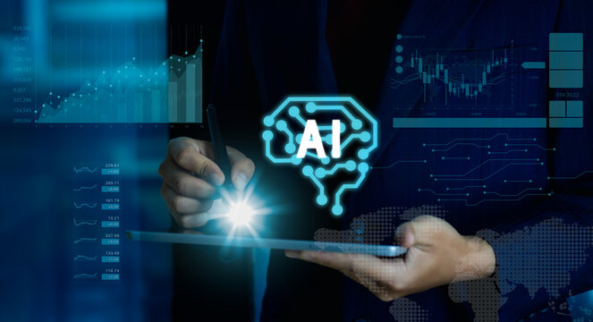 Businessman hand using pen mouse on tablet with glowing digital ai brian icon and graph on background. artificial intelligence technology concept.