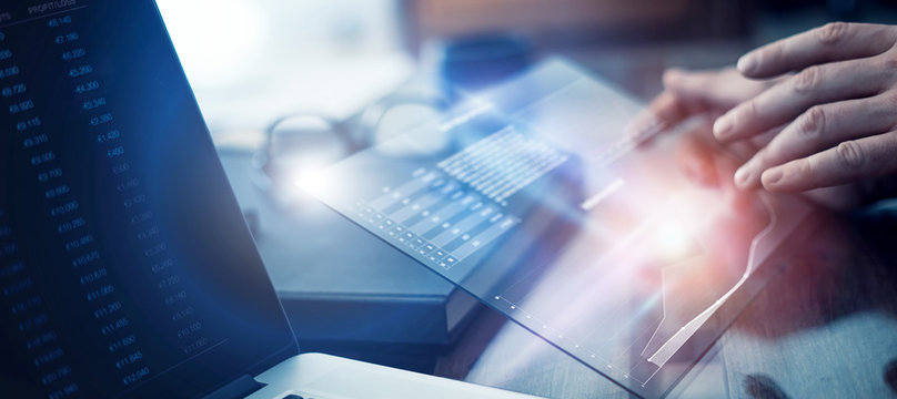 Professional businessman using tablet to analyze financial data, investment strategy, market trends, and growth chart
