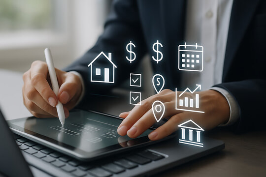 Real estate financial analytics with digital interface for property investment planning market research loan approval and mortgage banking using tablet device in business environment