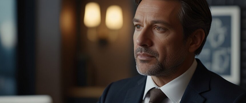 A businessman using a digital tablet to manage customer relationships, featuring a virtual network overlay of interconnected icons, representing CRM and global communication