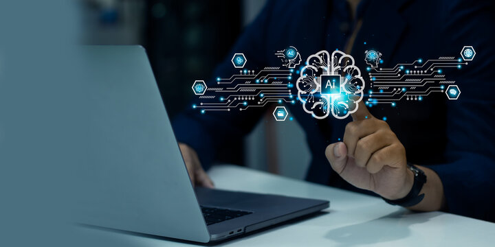Businessman using laptop computer connecting virtual ai smart brain assistant technology. Artificial Intelligence Chatting bot.
