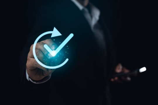 Businessman use digital pen touching Virtual blue Checkmark. Hand of a businessman interacting with a glowing green checkmark symbol on a dark background. Quality control assurance QC, QA Concept.