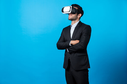 Business man looking data analysis by using VR glasses. Project manager checking business strategy by enter in metaverse or virtual reality world while wearing suit at white background. Deviation.