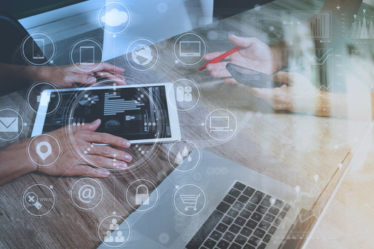 Designer and Businessman using smart phone and digital tablet and laptop computer in modern office with virtual screen interface icons diagram as concept