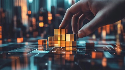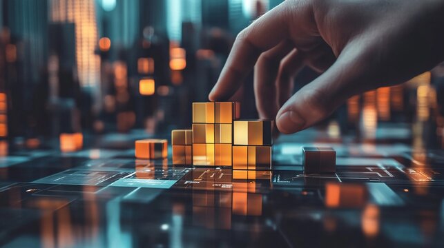 Businessman creates a bar graph using his hand and augmented reality cubes