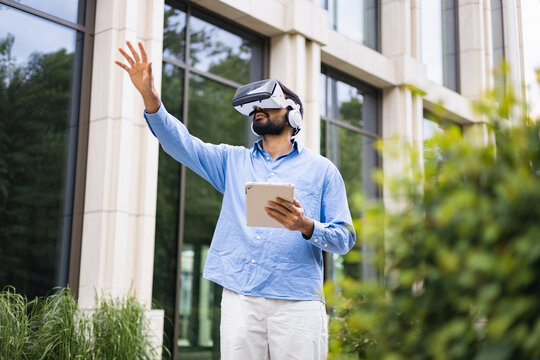 A man in a VR headset outside using a tablet, reaching out. Modern technology outdoors.