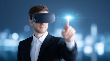 Businessman using VR headset with glowing interface on futuristic digital background in blue light concept of virtual interaction and technology.