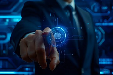 a businessman in a suit is utilizing a digital interface displaying startup concepts with charts and icons pointing with a pen high quality