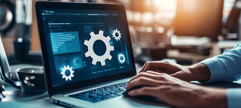Businessman Utilizing Laptop and Mouse with Gear Icon for Digital Marketing and Software Development