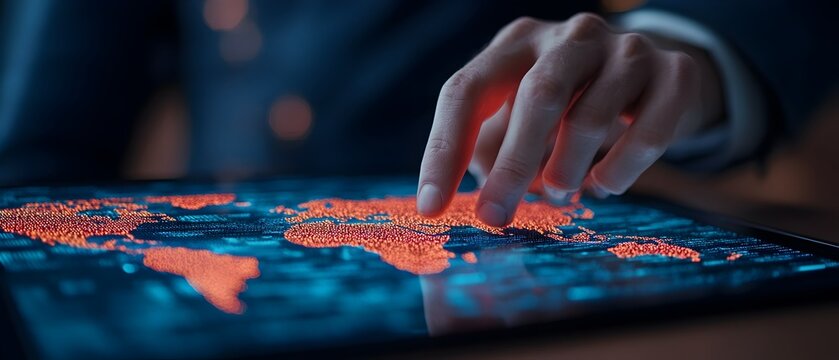 Businessman utilizing advanced digital data analytics tools on a high tech tablet device to visualize a holographic world map highlighting global business networks and enterprise connectivity