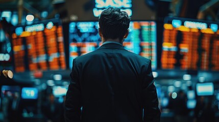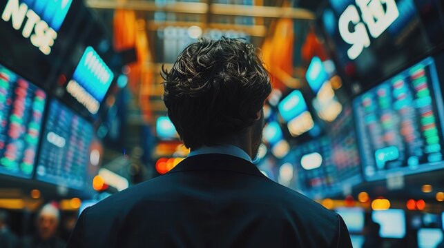 Man walking beneath digital financial data display