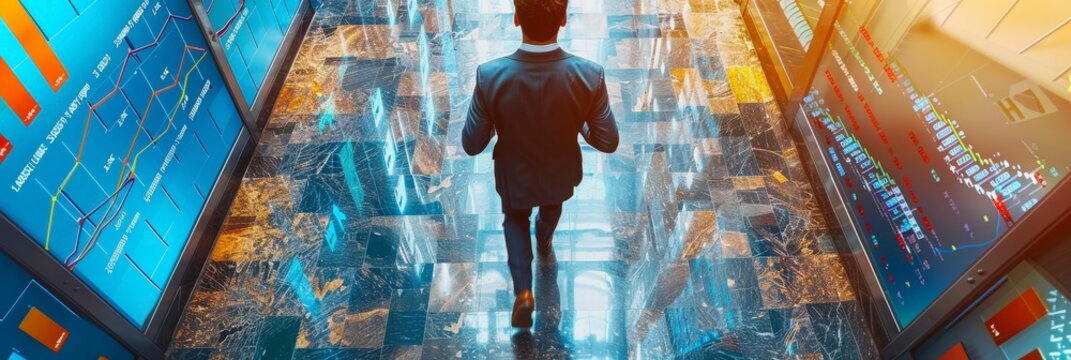 Businessman Walking Through A Hallway Of Stock Market Data.