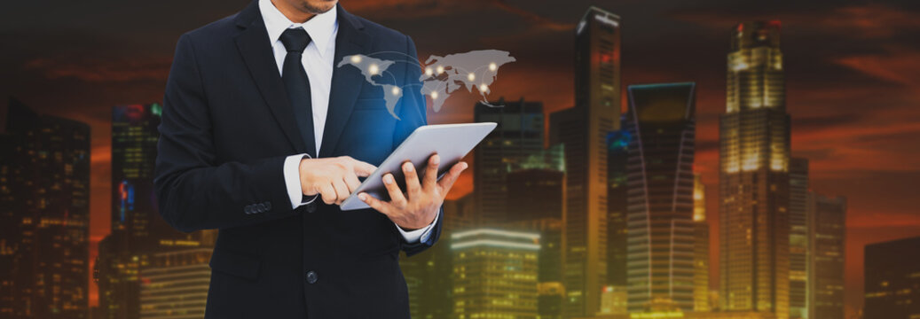 Attractive business man working on tablet. Businessman using tablet analyzing sales data and economic. Business innovation technology concept.