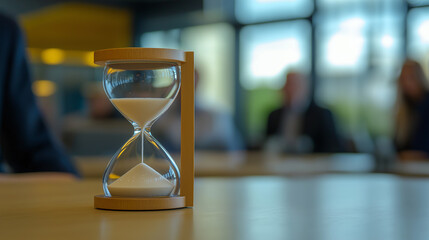 Hourglass with flowing sand on table in modern office, time management and productivity concept, countdown symbol, efficient work routine, passing time in business environment, focus and discipline