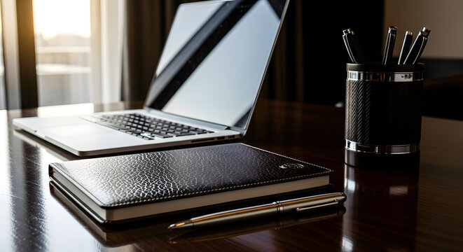Open Laptop with Black Notebook and Pen on Wooden Desk in Modern Office Setting