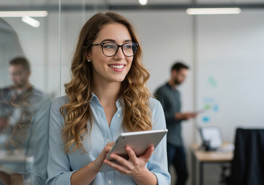 portrait of a confident businesswoman using a tablet, smiling at the camera in an office setting