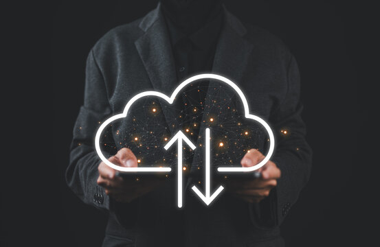 Businessman showing virtual glowing cloud computing to download and loading data information and upload on system network application. Technology data transformation concept,