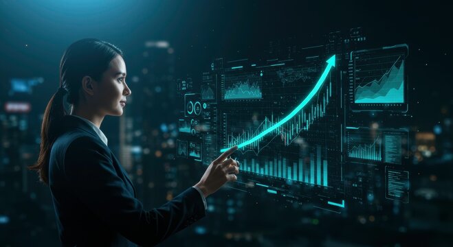Businesswoman Analyzing Financial Growth Data on Futuristic Interface at Night