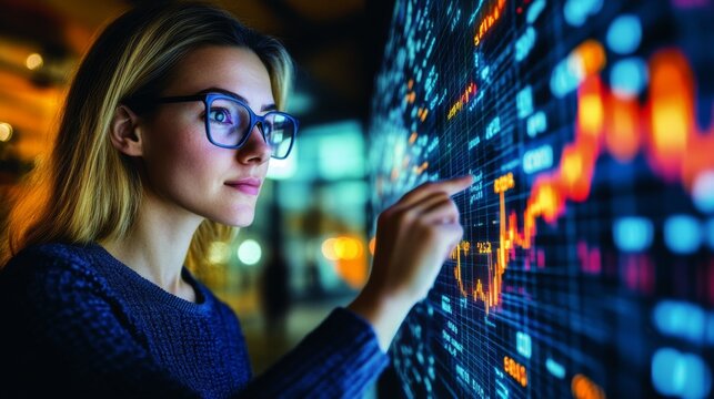 Businesswoman Analyzing Digital Data Visualization Interface Images