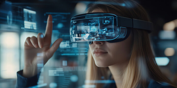 Businesswoman exploring virtual reality in modern office