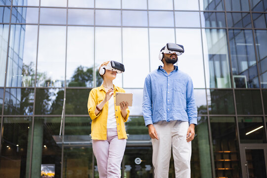 Two people wearing VR headsets explore augmented reality outdoors, near a modern glass building, with one holding a tablet.