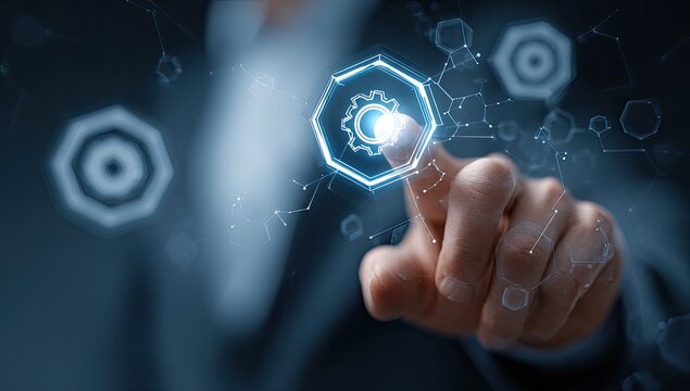 Businessperson's hand interacting with a futuristic digital interface, settings icon illuminated