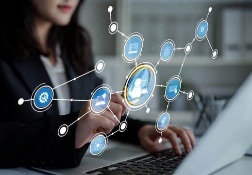 A business professional uses a laptop while interacting with digital network icons. This image captures technology, connectivity, and modern communication in a corporate setting. Crux