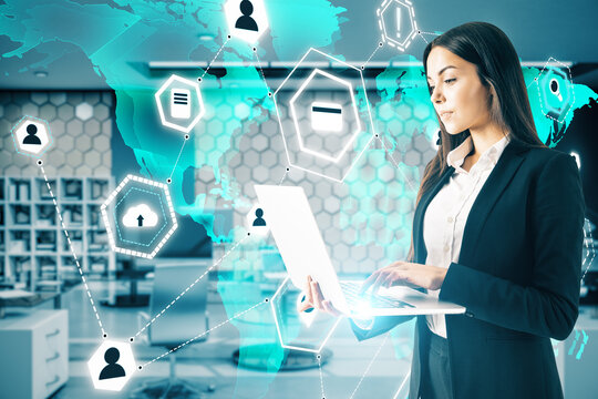 Futuristic businesswoman analyzing data holograms. I-powered corporate strategist amidst digital networks.