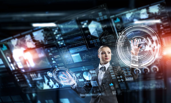 Businesswoman Using Advanced Interface Analyzing Data Images