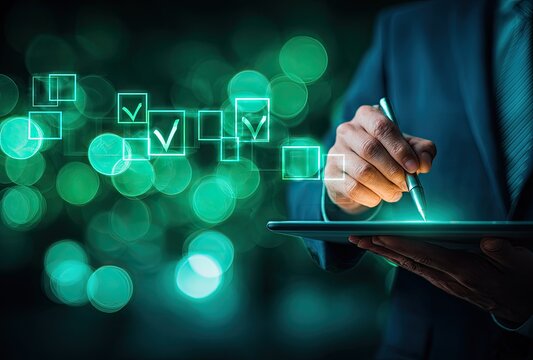 Businessperson using digital tablet to mark checkboxes, illuminated by glowing green checkmarks, against a bokeh background
