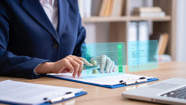 Businesswoman uses holographic interface to stamp document with digital approval in modern office