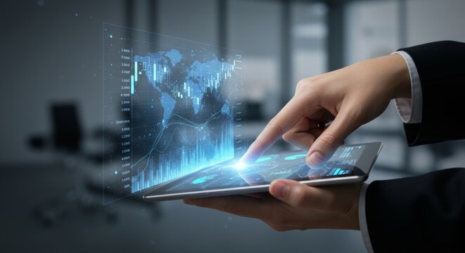 Businessman using tablet with an ai interface overlayed abstract data visualizations and charts floating analyzing financial data and performance charts, representing growth and success. Impute