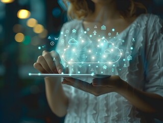 Businesswoman Utilizing Cloud Based Enterprise Resource Planning System on Tablet for Optimized Business
