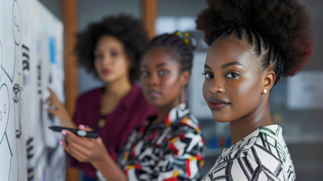 Team or group of three multiethnic and diverse businesswomen standing in office near the whiteboard. Female employees information presentation, drawing or writing with marker, planning strategy