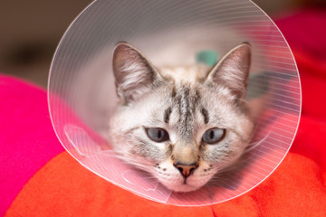 Pet care concept Sleepy cat wearing Elizabethan collar, E-collar or buster collar for protection the wound after surgical operation with copy space