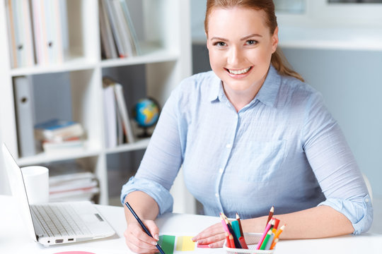 Young businesswoman working in office. Beautiful woman making notes while sitting on working place.