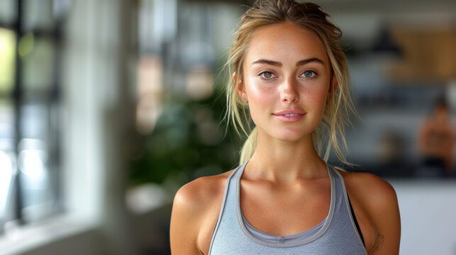 Welcoming blonde woman as office worker, smiling receptionist with modern office background