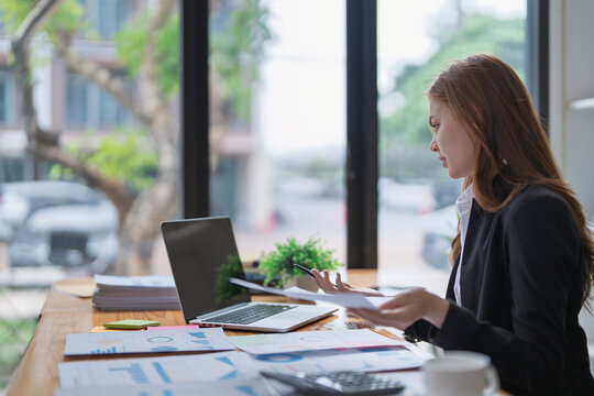 Businesswoman analyzing data at modern office workspace