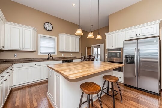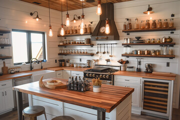 A panoramic view of a spacious Modern Craftsman kitchen highlighting a large island with butcher block countertops and sophisticated pendant lighting