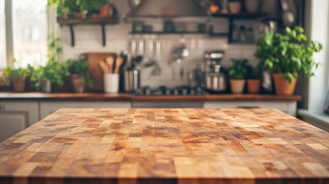 Modern kitchen island with butcher block countertop, stainless steel appliances, and hardwood floors.