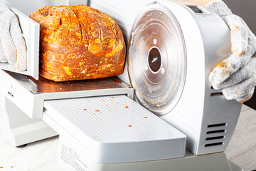 Butcher Slicing Large Cut Of Beef On Cutting Machine Images